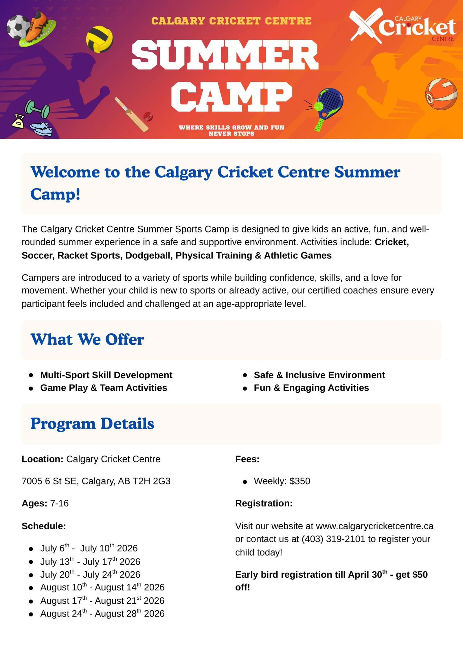 The Calgary Cricket Centre Summer Sports Camp is designed to give kids an active, fun, and well-rounded summer experience in a safe and supportive environment. Activities include: Cricket, Soccer, Racket Sports, Dodgeball, Physical Training, Athletic Games and Arts and Crafts.